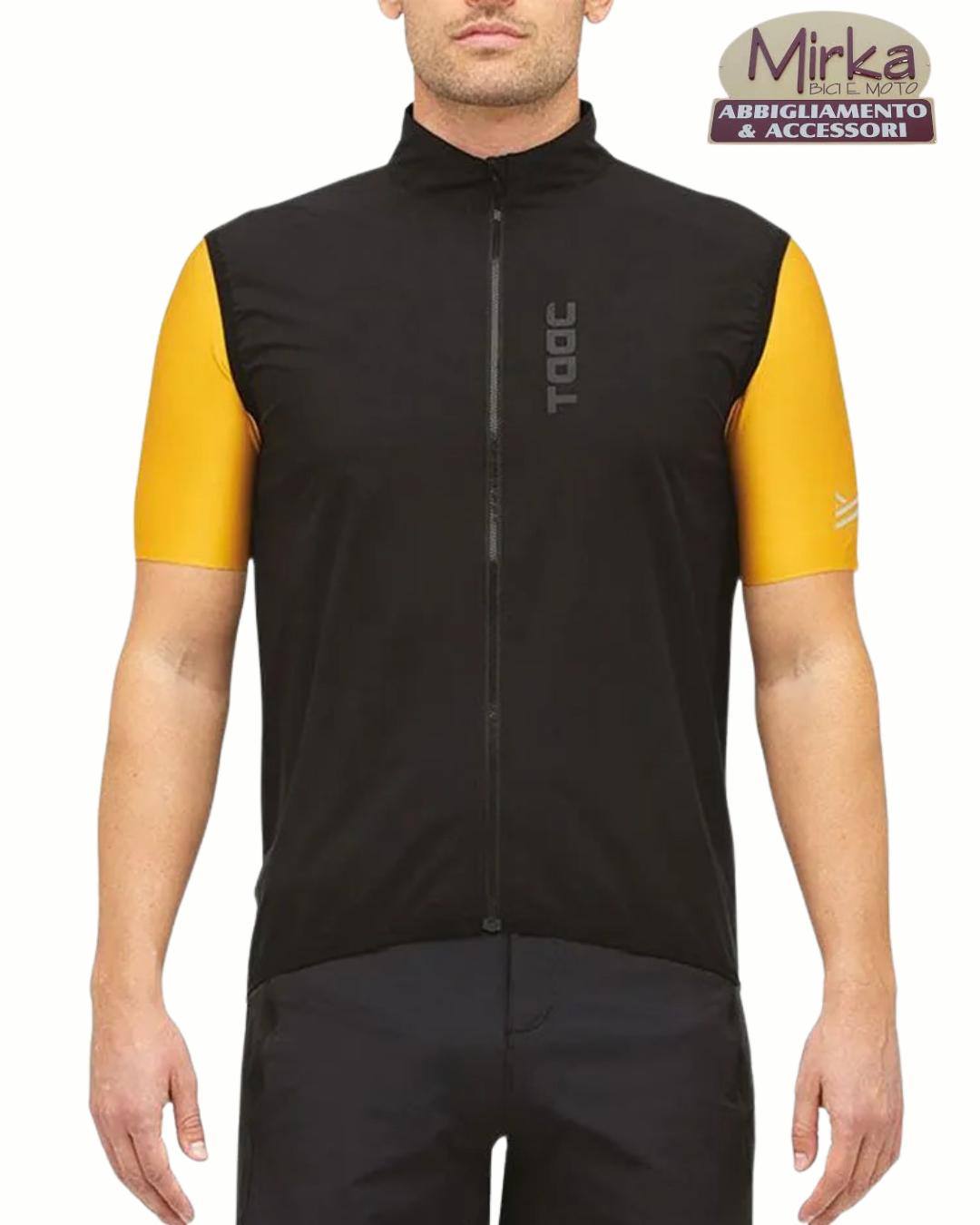 Esterno in poliestere stretch con trattamento water repellent. Ampio pannello di ventilazione in rete di poliester sulla schiena. Tasca centrale posteriore trasformabile in sacchetto contenitore di minimo ingombro. Inserti rifrangenti sulle braccia e sulla zona lombare. Quick dry.