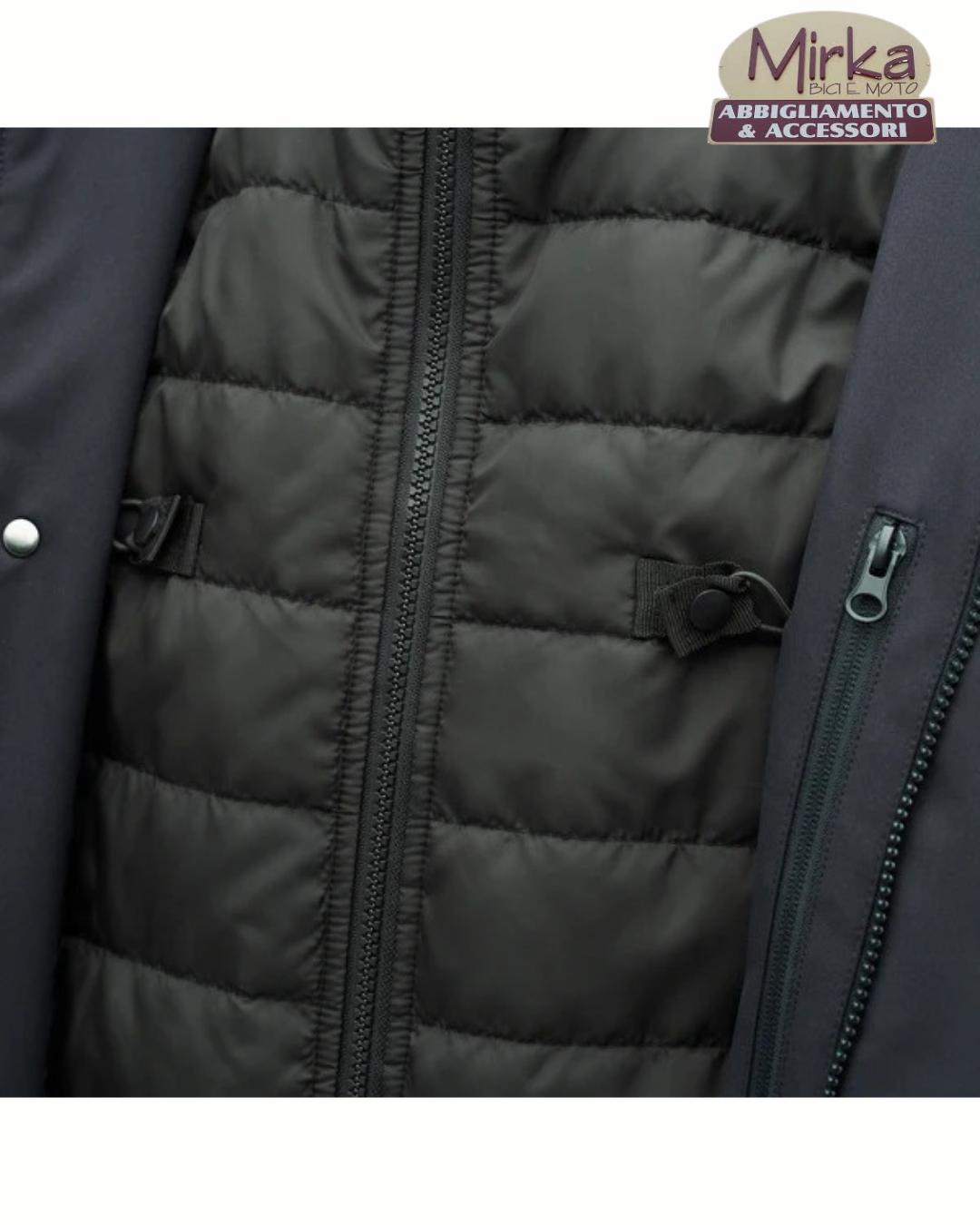 HYDROSCUD. Esterno softshell a tre strati: Poliestere stretch ad alta tenacità con trattamento water resistant, membrana traspirante antivento e impermeabile, interno in morbida rete 3D. Gilet staccabile interno imbottito di ovatta di poliestere. Regolazione sui posi, spacco con bottone sul fondo per facilitare la seduta.