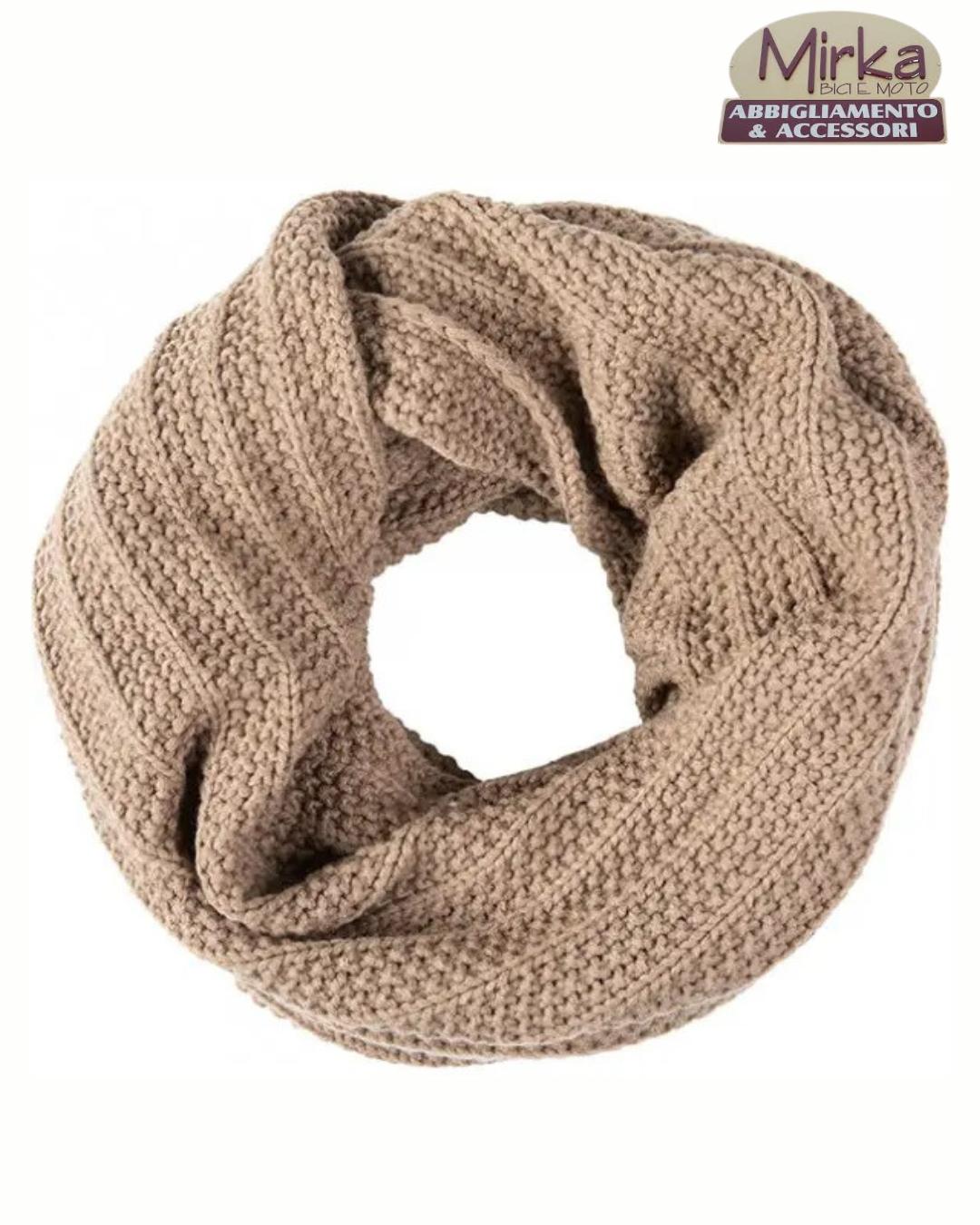 Sciarpone ad anello multiuso in maglia con intreccio a trama grano di riso. Acrilico. Utilizzabile in sostituzione della sciarpa o come copri spalle.